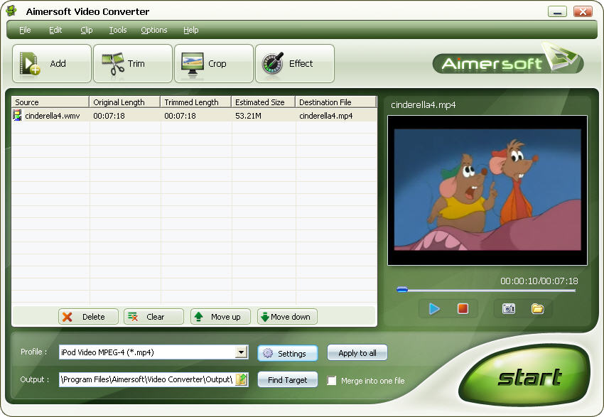 Aimersoft Video Converter is the best video file conversion software for you to convert video files and put video on iPod or other players, After finishing video conversion, you can play the video on players like iPod, Zune, iPhone, Apple TV, PSP, Xbox 360, PS3, Archos, iRiver, Creative Zen, PMP, Smart Phone, Pocket PC, PDA, Mobile Phone, etc.